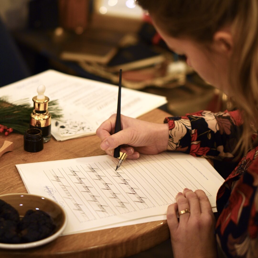 Participants will be guided through the foundational and essential techniques of Copperplate calligraphy: how to hold the pen, write with a steel nib, control pressure, and form the basic strokes that create beautiful letter shapes.